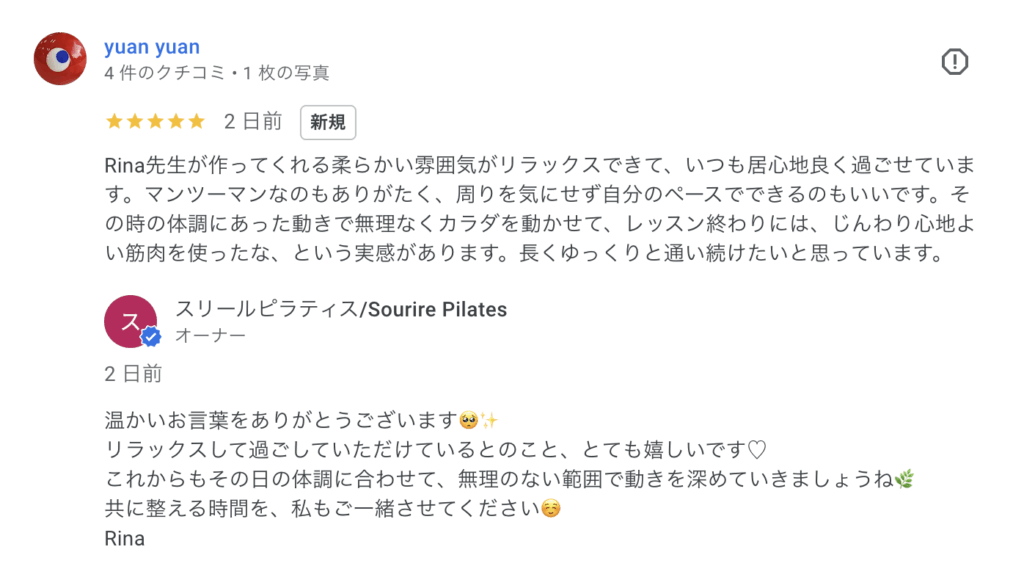 Rina先生が作ってくれる柔らかい雰囲気がリラックスできて、いつも居心地良く過ごせています。マンツーマンなのもありがたく、周りを気にせず自分のペースでできるのもいいです。その時の体調にあった動きで無理なくカラダを動かせて、レッスン終わりには、じんわり心地よい筋肉を使ったな、という実感があります。長くゆっくりと通い続けたいと思っています。